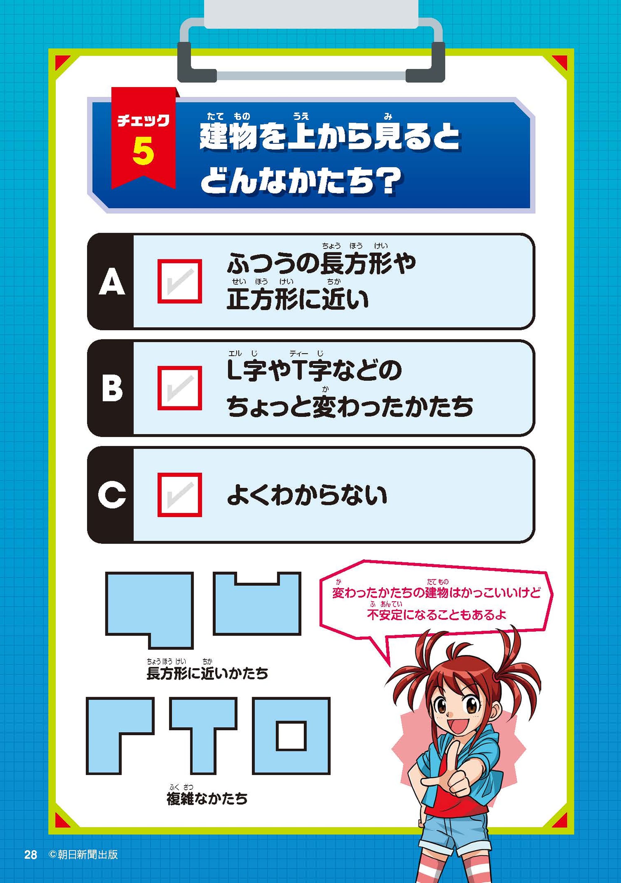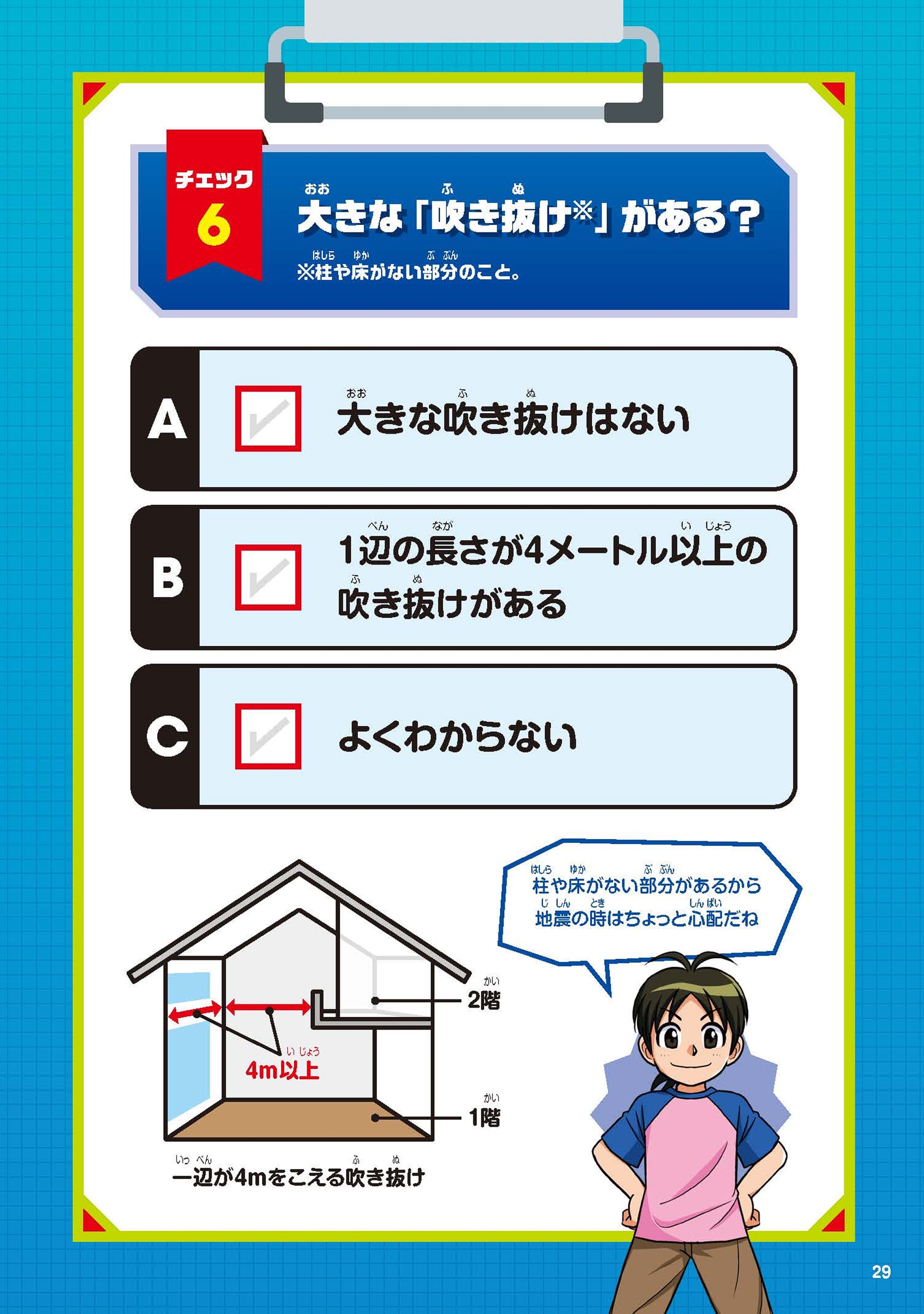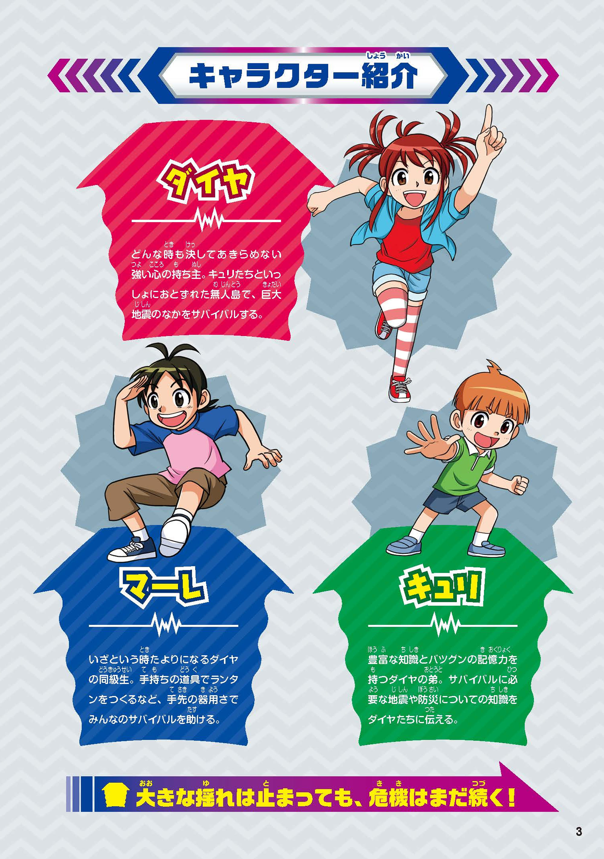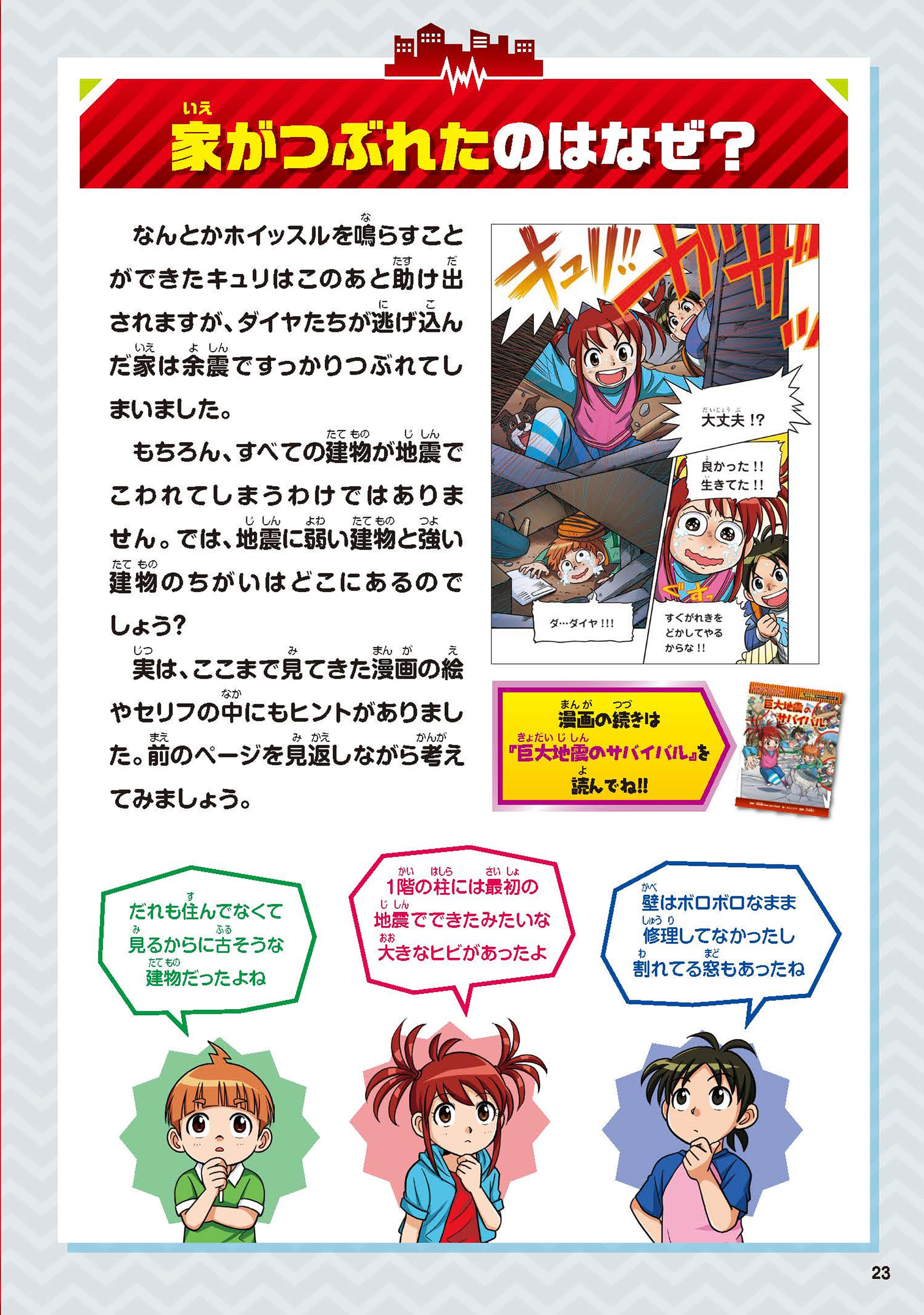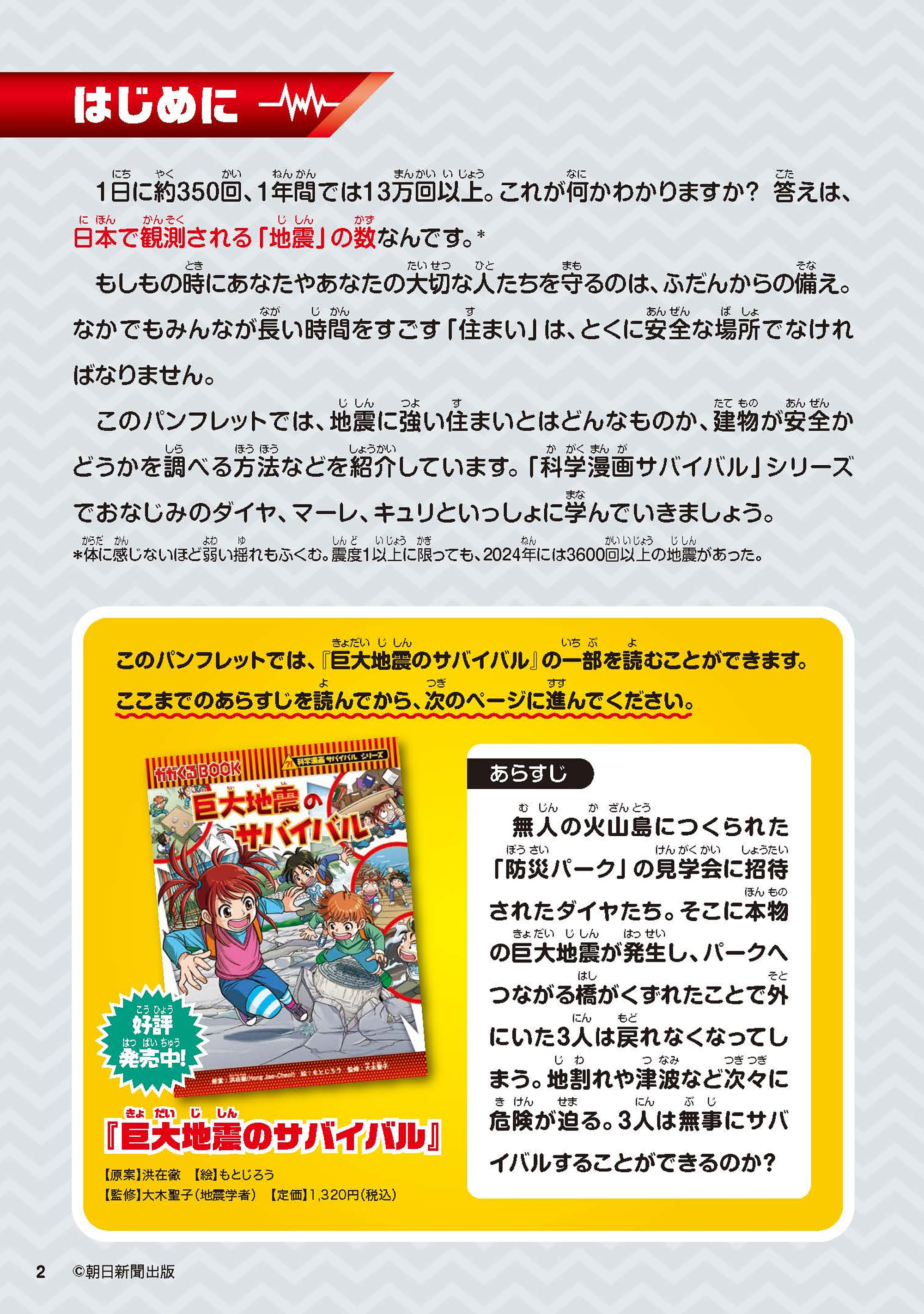 1日に約350回、1年間では13万回以上。これが何かわかりますか?答えは、日本で観測される「地震」の数なんです。もしもの時にあなたやあなたの大切な人たちを守るのは、ふだんからの備え。なかでもみんなが長い時間をすごす「住まい」は、とくに安全な場所でなければなりません。このパンフレットでは、地震に強い住まいとはどんなものか、建物が安全かどうかを調べる方法などを紹介しています。「科学漫画サバイバル」シリーズでおなじみのダイヤ、マーレ、キュリといっしょに学んでいきましょう。