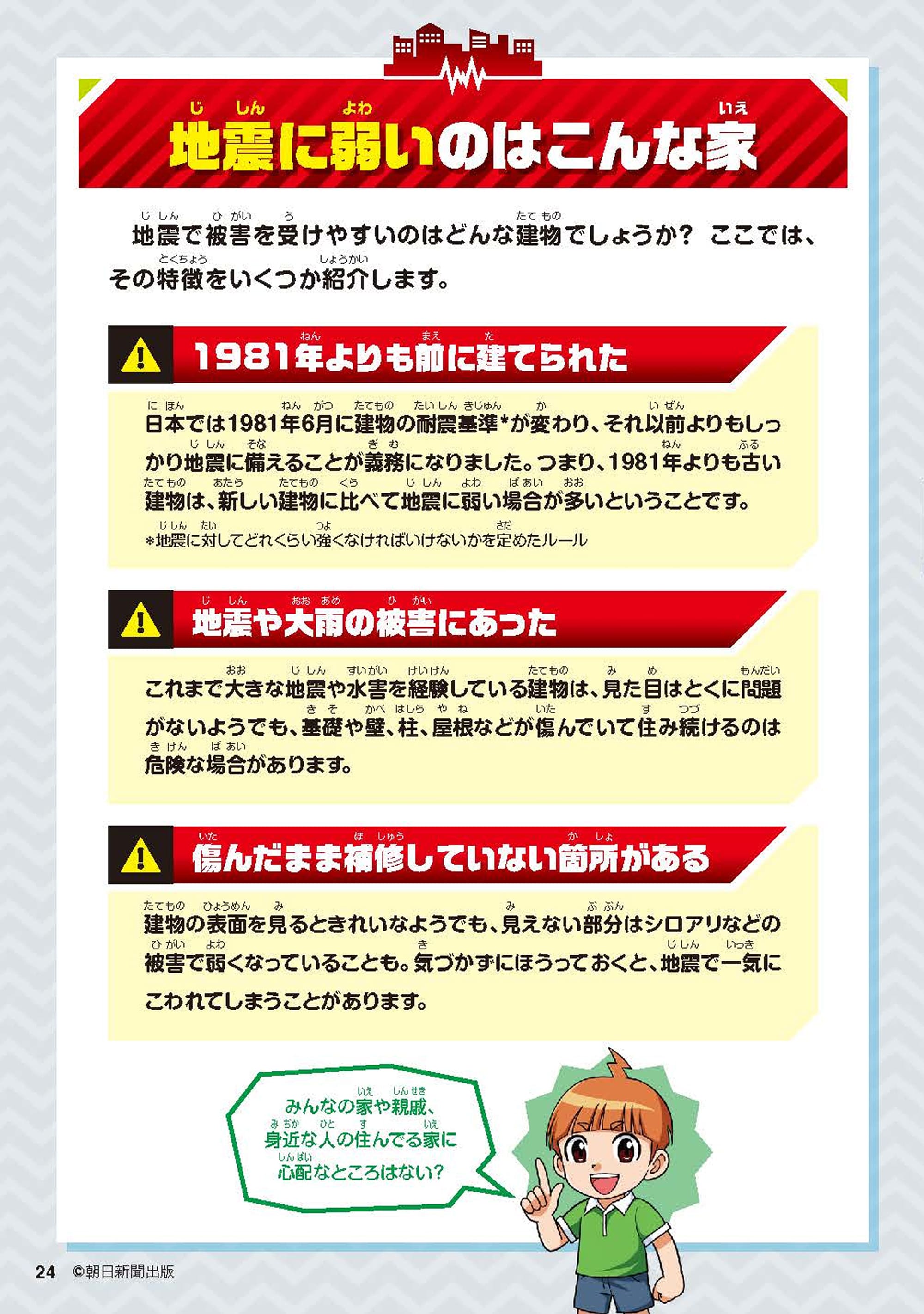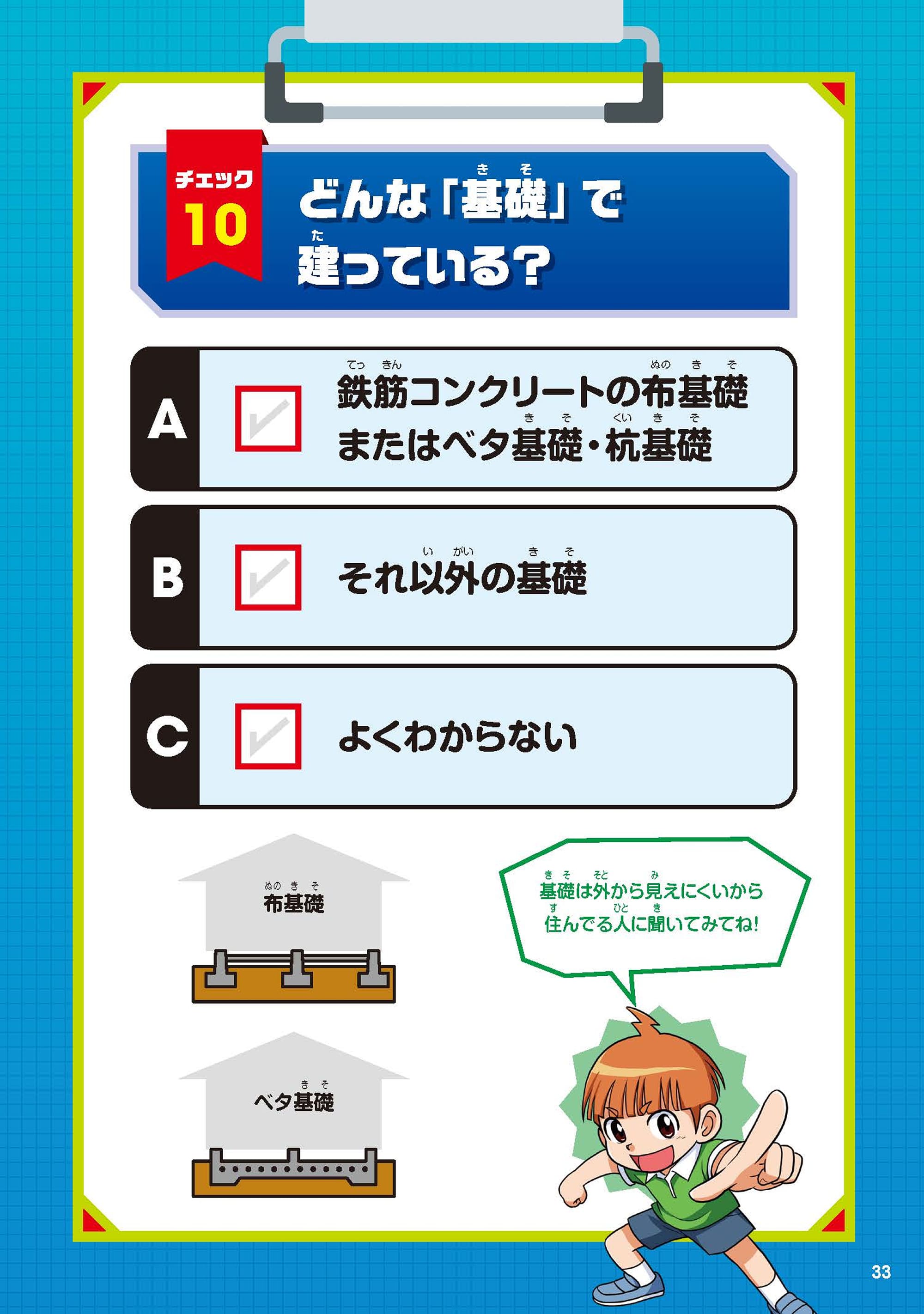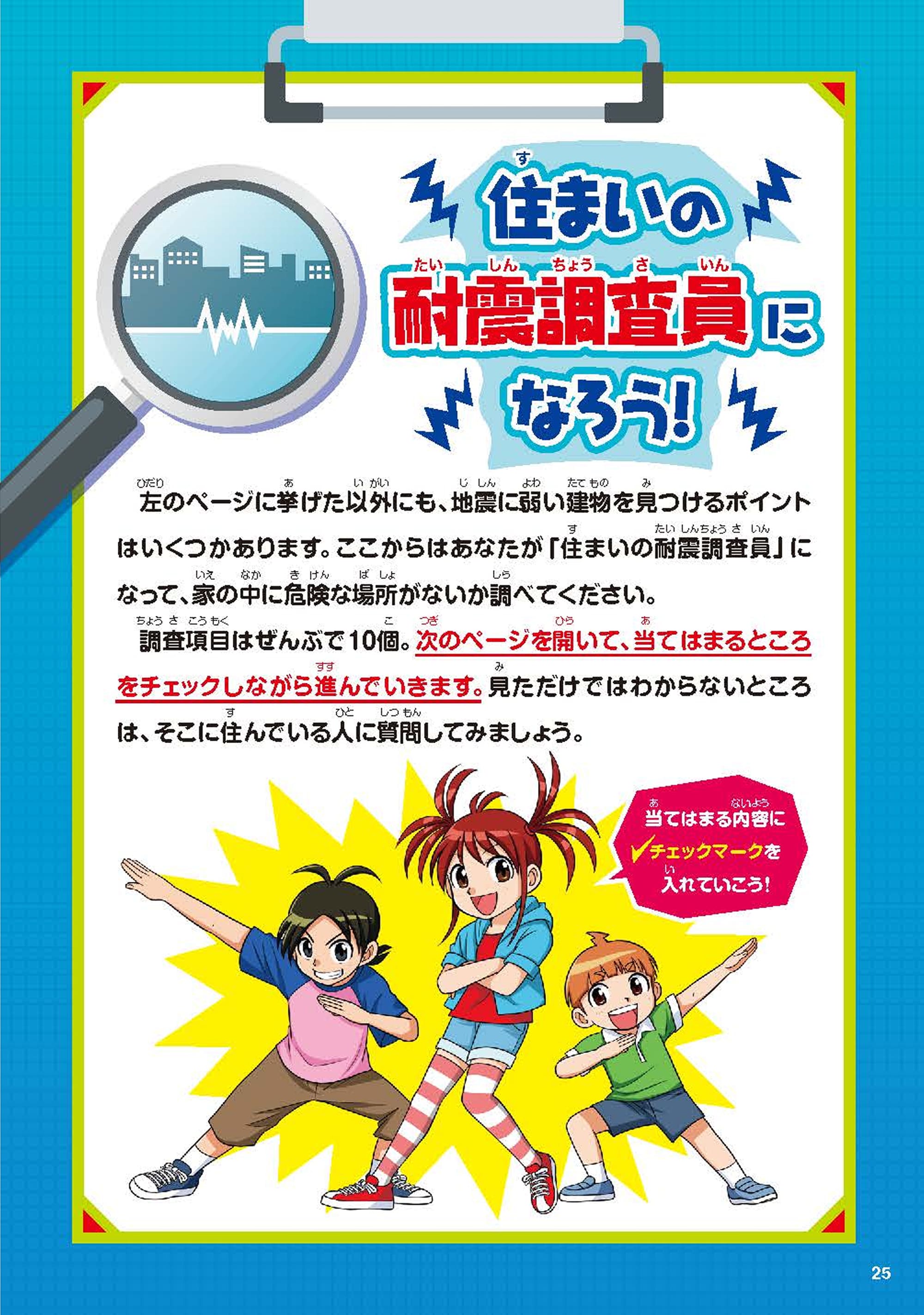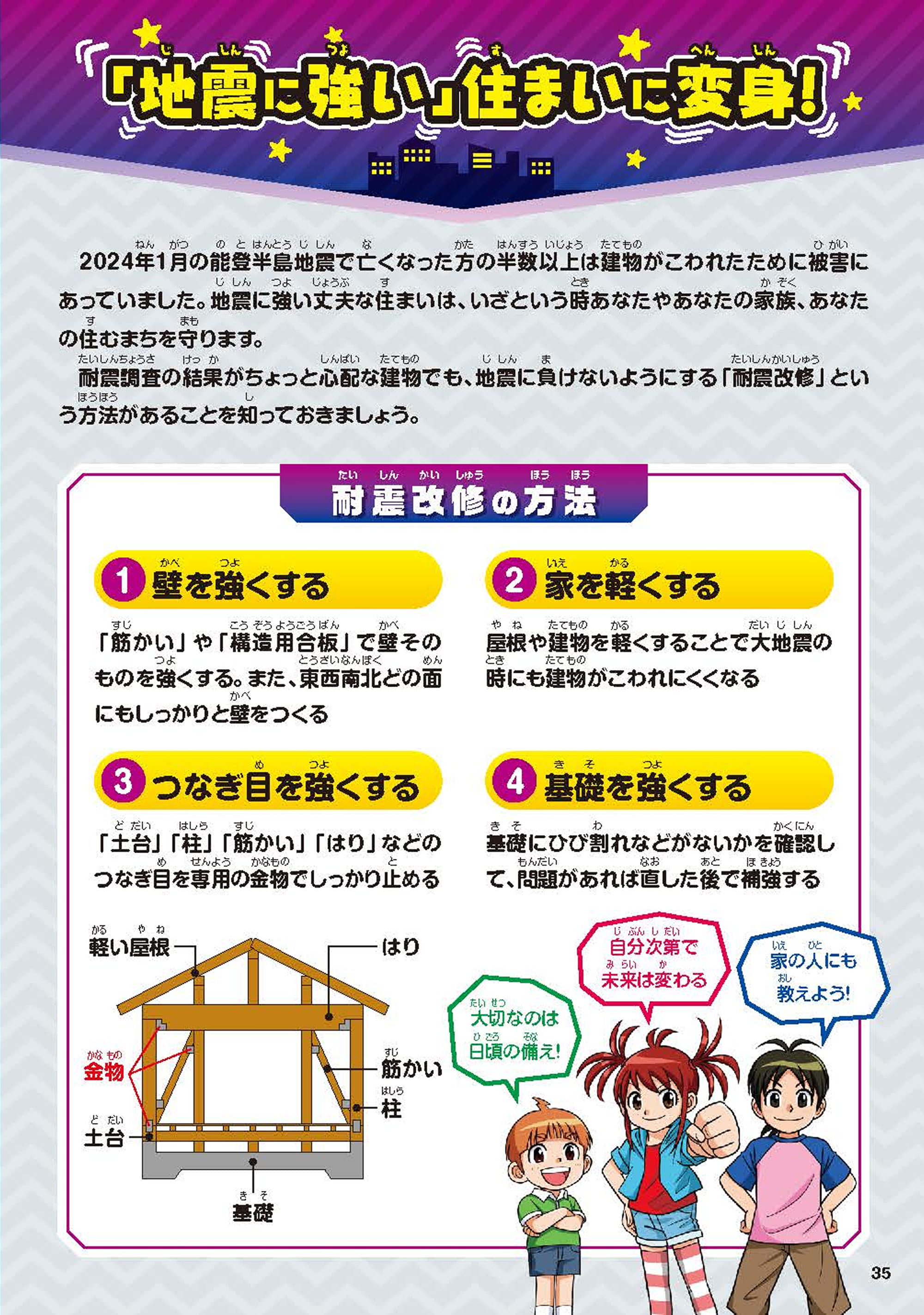 1日に約350回、1年間では13万回以上。これが何かわかりますか?答えは、日本で観測される「地震」の数なんです。もしもの時にあなたやあなたの大切な人たちを守るのは、ふだんからの備え。なかでもみんなが長い時間をすごす「住まい」は、とくに安全な場所でなければなりません。このパンフレットでは、地震に強い住まいとはどんなものか、建物が安全かどうかを調べる方法などを紹介しています。「科学漫画サバイバル」シリーズでおなじみのダイヤ、マーレ、キュリといっしょに学んでいきましょう。