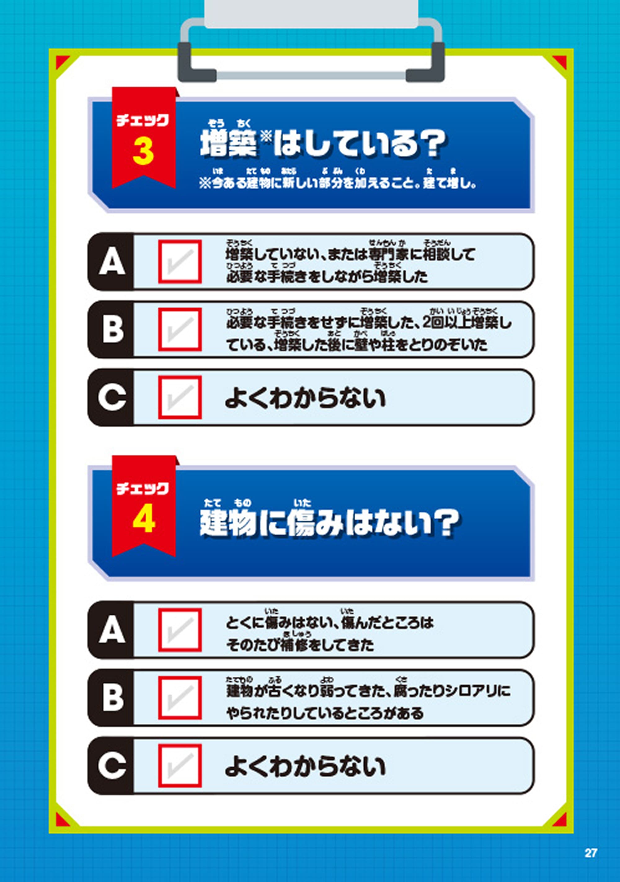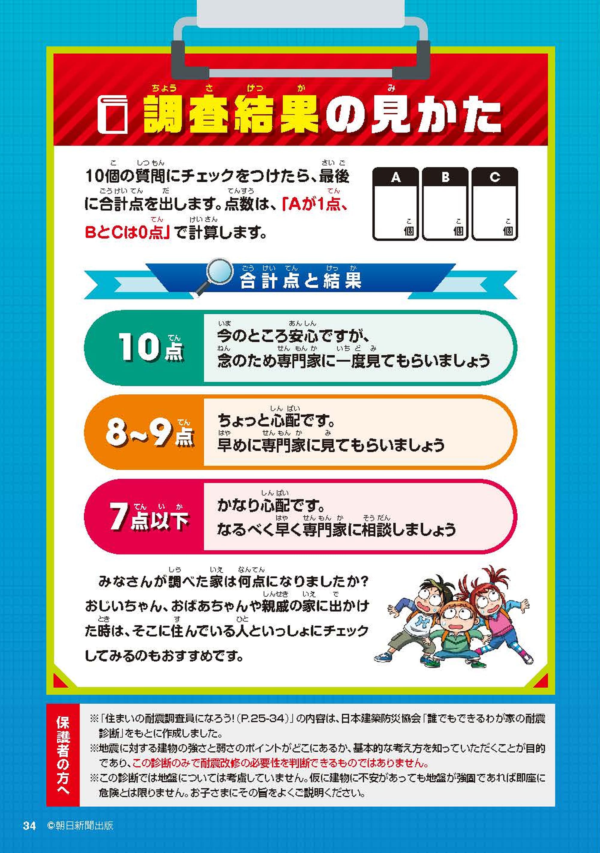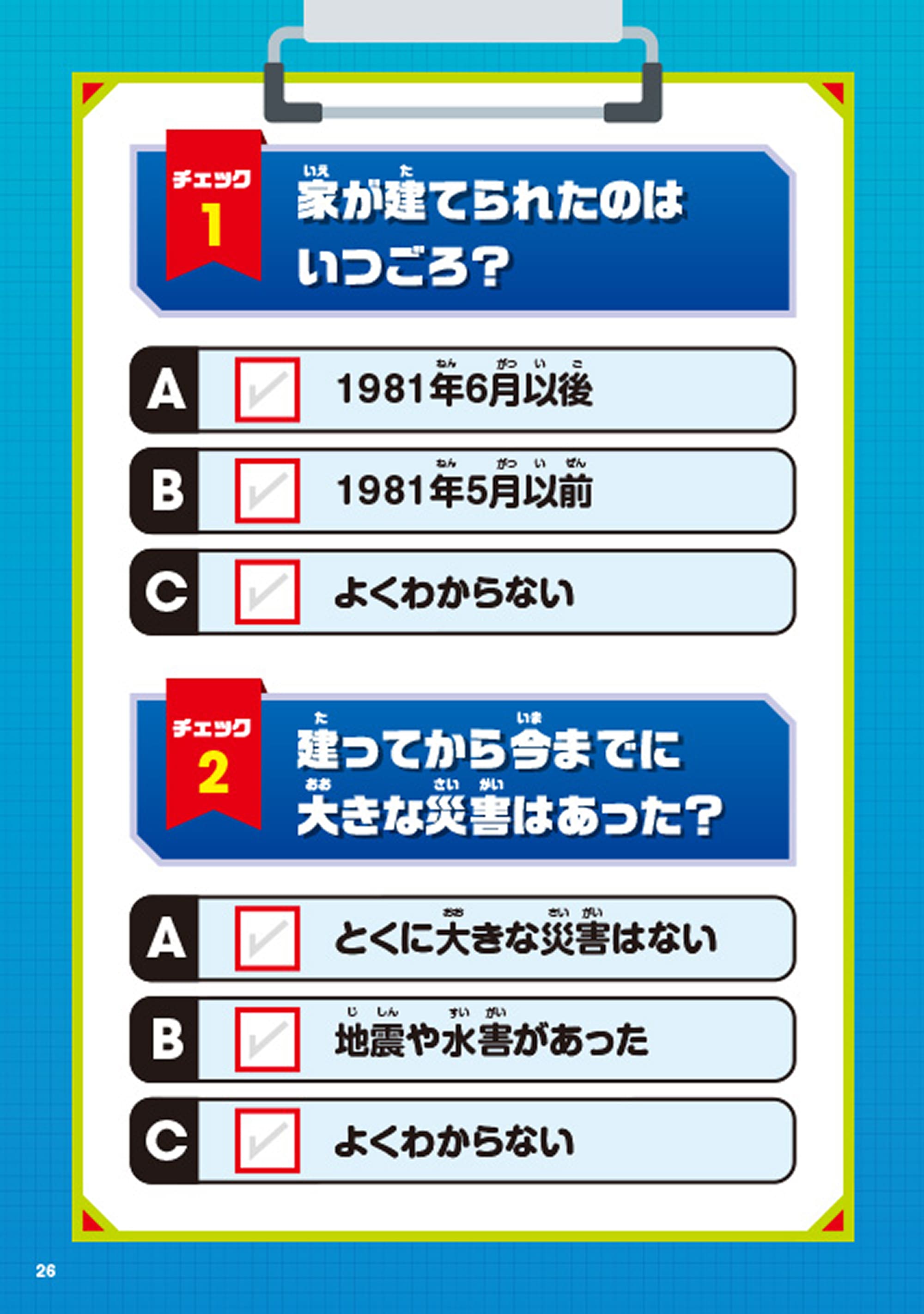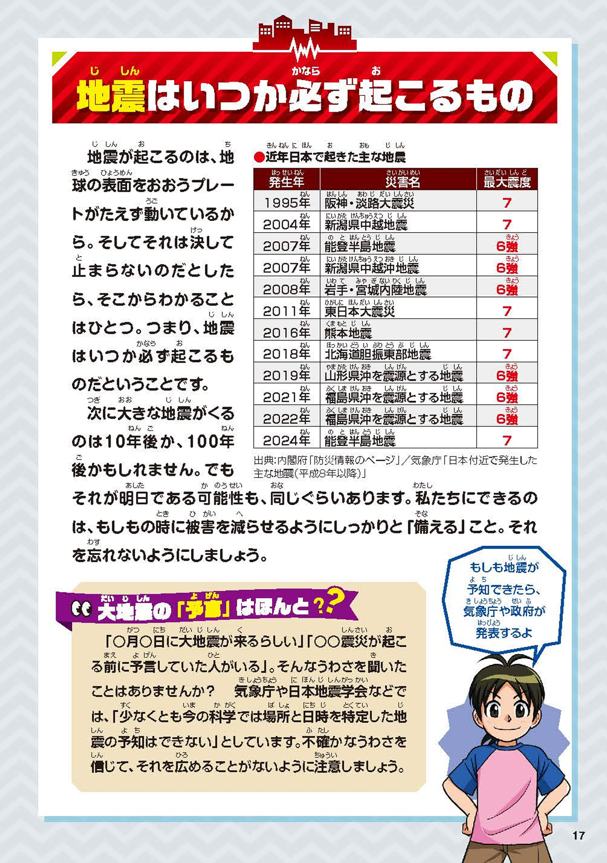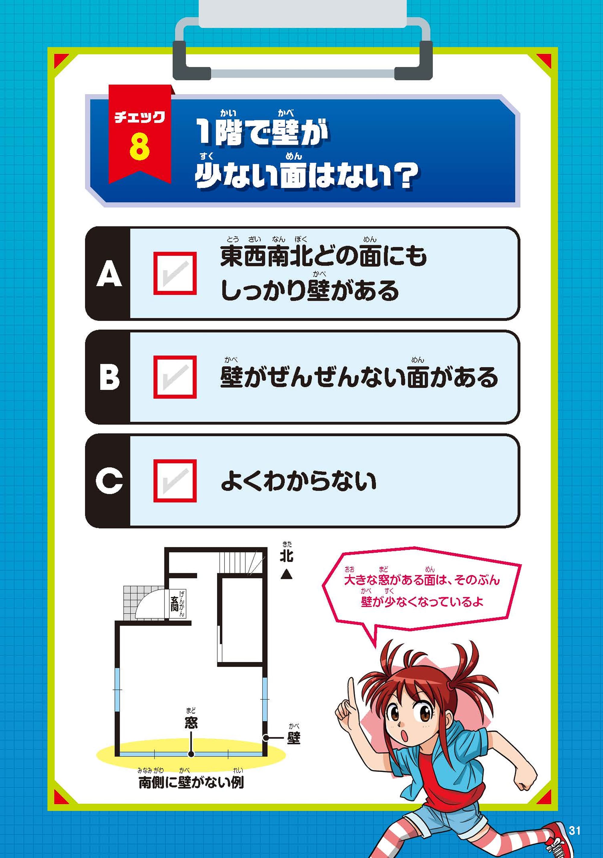 1日に約350回、1年間では13万回以上。これが何かわかりますか?答えは、日本で観測される「地震」の数なんです。もしもの時にあなたやあなたの大切な人たちを守るのは、ふだんからの備え。なかでもみんなが長い時間をすごす「住まい」は、とくに安全な場所でなければなりません。このパンフレットでは、地震に強い住まいとはどんなものか、建物が安全かどうかを調べる方法などを紹介しています。「科学漫画サバイバル」シリーズでおなじみのダイヤ、マーレ、キュリといっしょに学んでいきましょう。